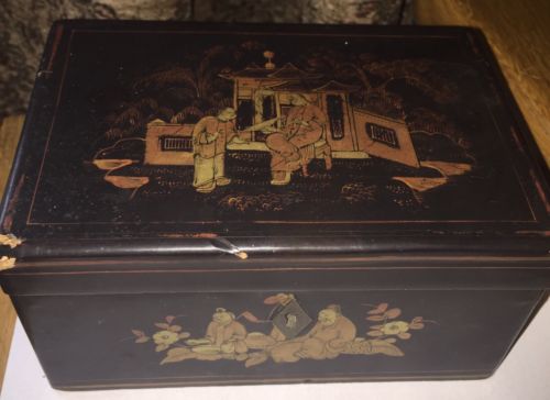 Title (ebay affiliate link): Chinese Jewelry Trinket Sewing Box Wood Hand Painted Gilt Aluminum Insert Etched