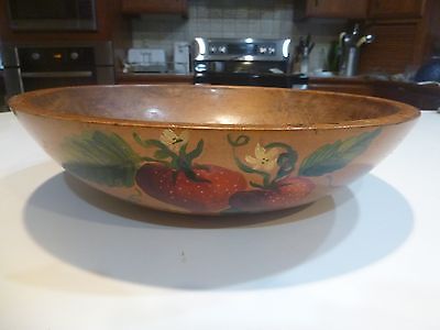 Antique Signed Munising Wood Bowl W/ Hand Painted Strawberries 11"