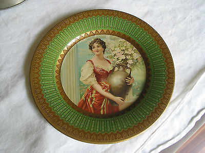 ANTIQUE VICTORIAN LADY PORTRAIT FLORAL TIN LITHO PRINT VIENNA ART STYLE PLATE