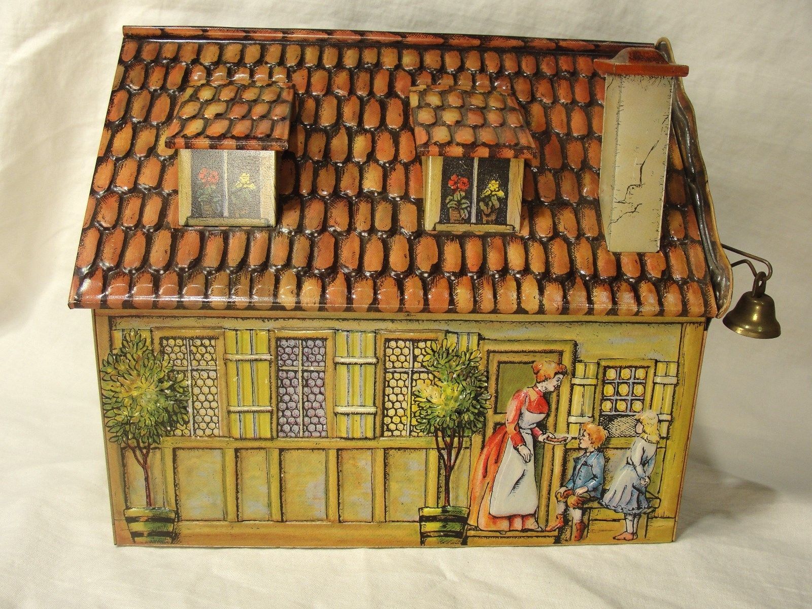 Vtg West German Tin Litho Biscuit /Cookie Tin Cottage w/ Free-swinging Bell