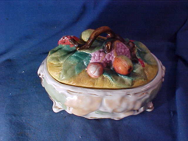 19thc STAFFORDSHIRE England FIGURAL Porcelain BASKET Of FRUIT Trinket BOX