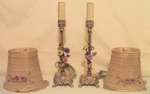Title (ebay affiliate link): PAIR ANTIQUE SHABBY TOLE BOUDOIR LAMPS W/PORCELAIN FLOWERS BEDROOM PARLOR TABLE