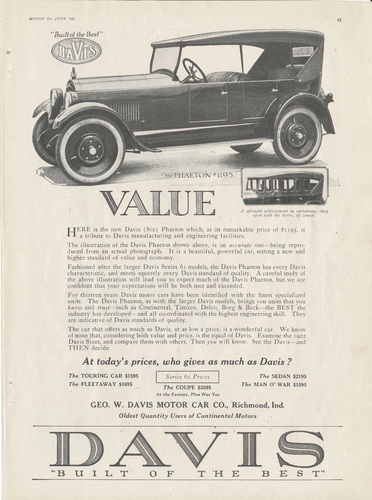 1922 DAVIS PHAETON TOURING MOTOR CAR AD RICHMOND INDIANA FIRST INDY 500 WINNERS