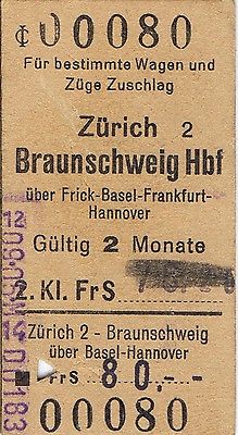 Title (ebay affiliate link): Railway ticket Switzerland Germany Zurich to Braunschweig single 1963