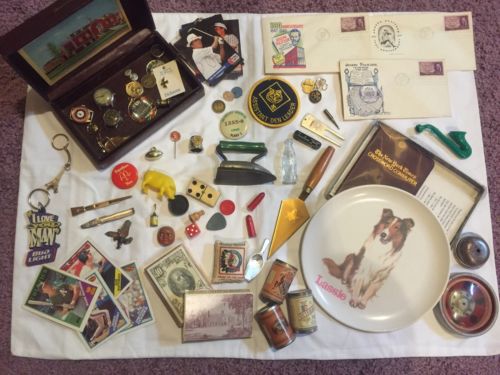 Title (ebay affiliate link): VTG Men's Junk Drawer Lot CocaCola Mini Iron FDC's Baseball Cards Watches Mason+