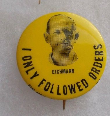 Title (ebay affiliate link): Vintage 1962 "I Only Followed Orders" (Eichmann) Anti-War Button by Karl Segal