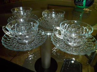 ANCHOR HOCKING DEPRESSION BLUE BUBBLE 4 CUPS/4 SAUCERS