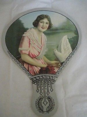 Title (ebay affiliate link): 1921 Advertising Fan Girl w/ Dove Romanos Bros Deli Lawrence Massachusetts
