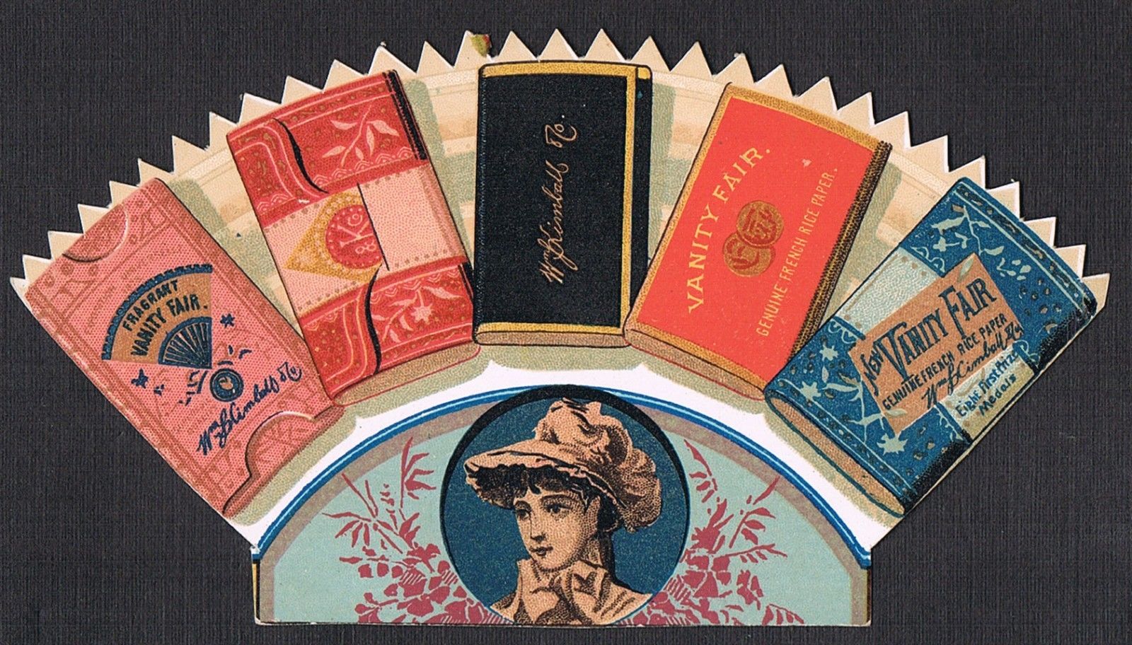 Title (ebay affiliate link): Die Cut Trade Card~Beauty Surrounded By Packages Of Vanity Fair Cigarette Paper