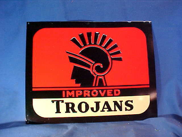 Title (ebay affiliate link): 1970s IMPROVED TROJAN CONDOMS Drug Store TIN Litho ADVERTISING SIGN