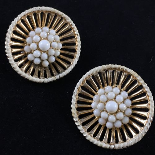 Title (ebay affiliate link): Vintage Clip Earring Round Flower Wheel Milk Glass Gold Tone Statement Y133
