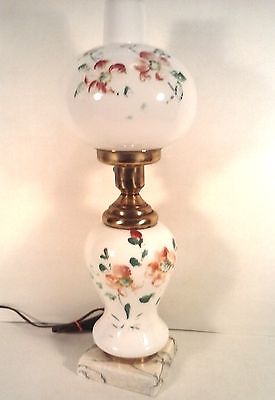 VINTAGE ANTIQUE 20" HURRICANE ELECTRIC TABLE LAMP MILK GLASS WHITE FLORAL MARBLE