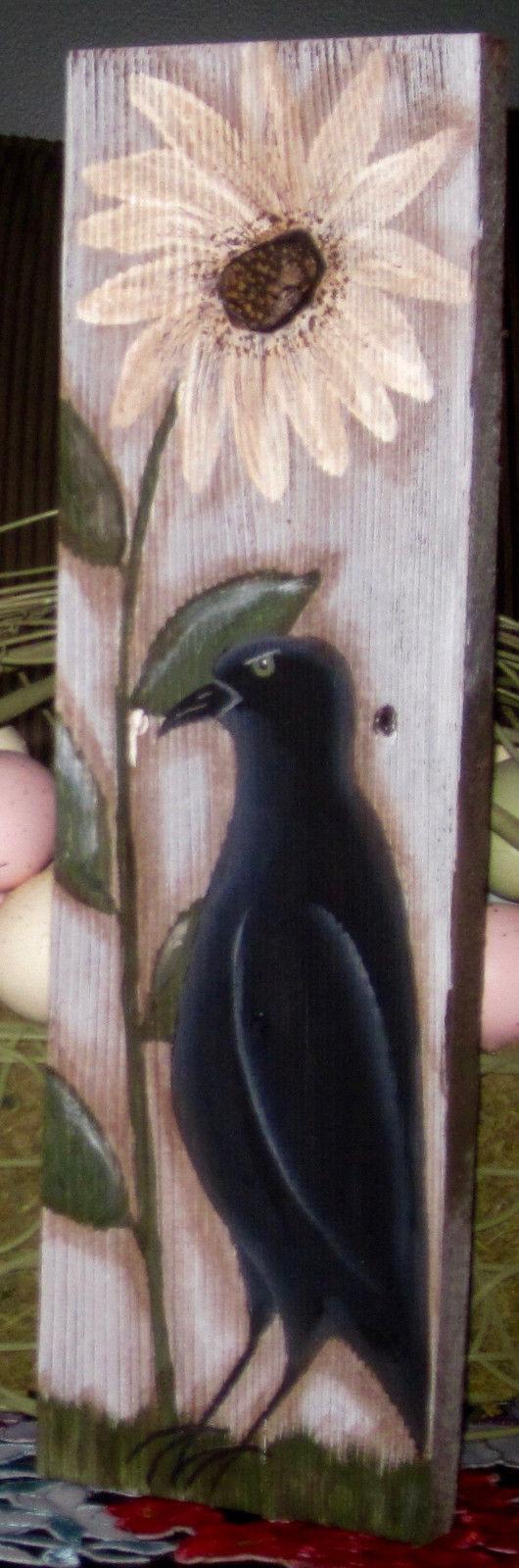Title (ebay affiliate link): *~*PRIMITIVE*~* HP FOLK ART PRIM CROW *~* DAISY *~* OLD RECLAIMED WOOD