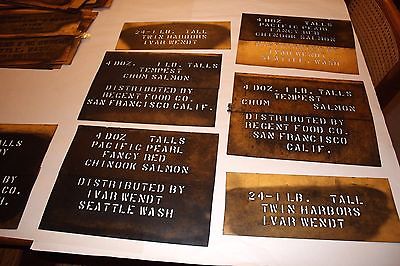 A COLLECTION OF ABOUT 100 EARLY SALMON BOX STENCILS FOR MANY DIFFERENT PACKERS