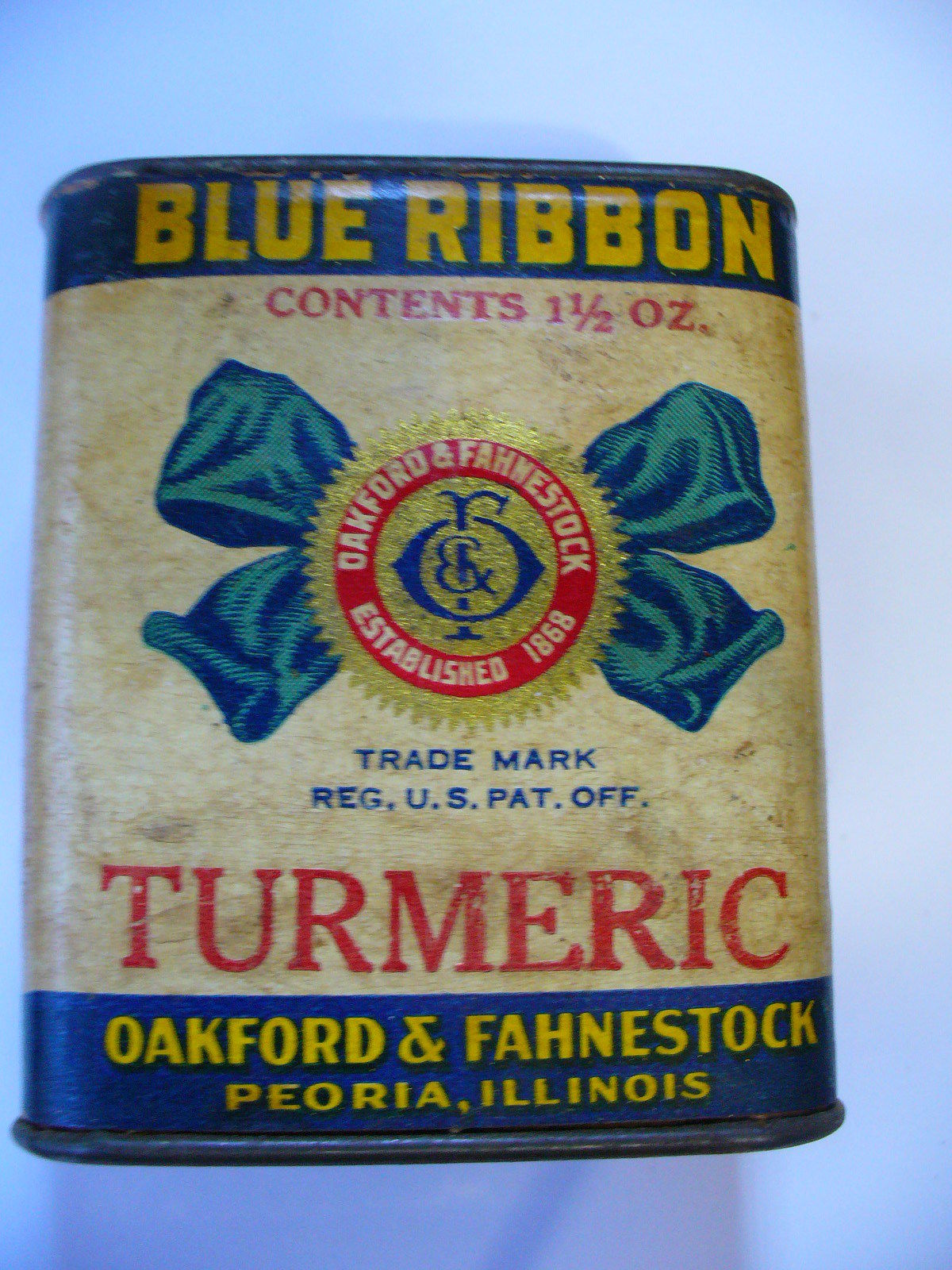 Title (ebay affiliate link): Vintage BLUE RIBBON TURMERIC Cardboard & Metal Spice Tin - Colorful Graphics