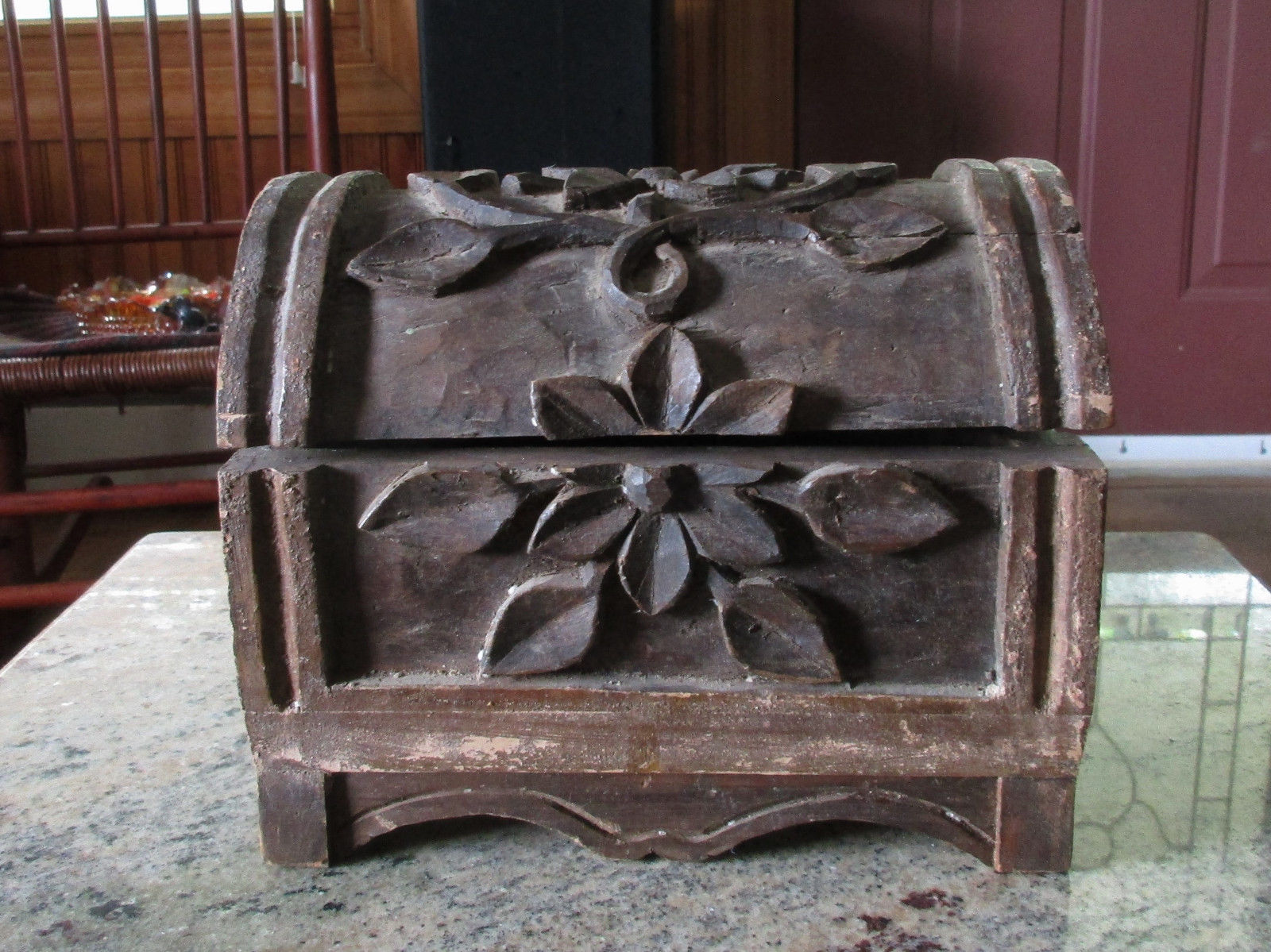 Title (ebay affiliate link): Antique Folk Art Hand Carved Flower Design Footed Wooden Box w/Domed Lid