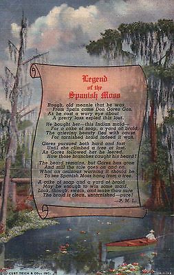 Legend of the Spanish Moss, Florida FL, Poem, Boat -- Old Vintage Linen Postcard