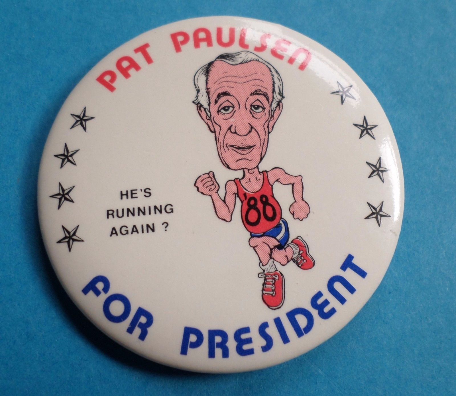 Title (ebay affiliate link): Pat Paulson "He's Running Again? For President" Campaign Pin Back Button 1988
