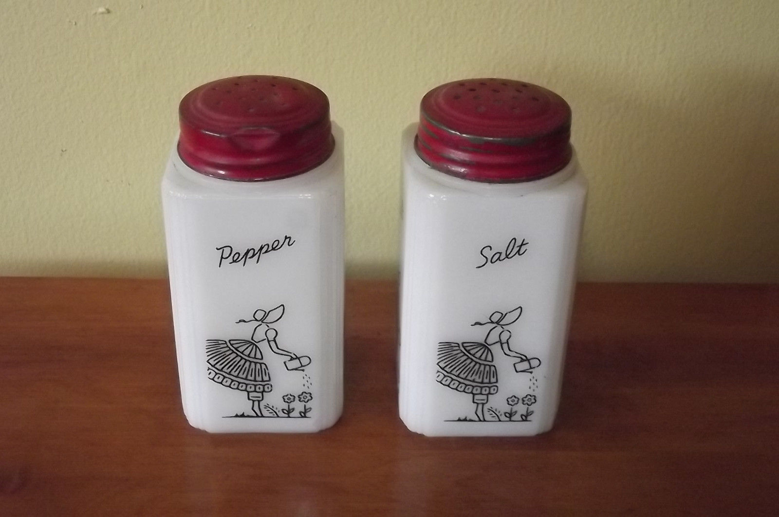 Title (ebay affiliate link): Vintage Tipp Milk Glass Ladies Watering Flowers Salt & Pepper Shakers Red Tops