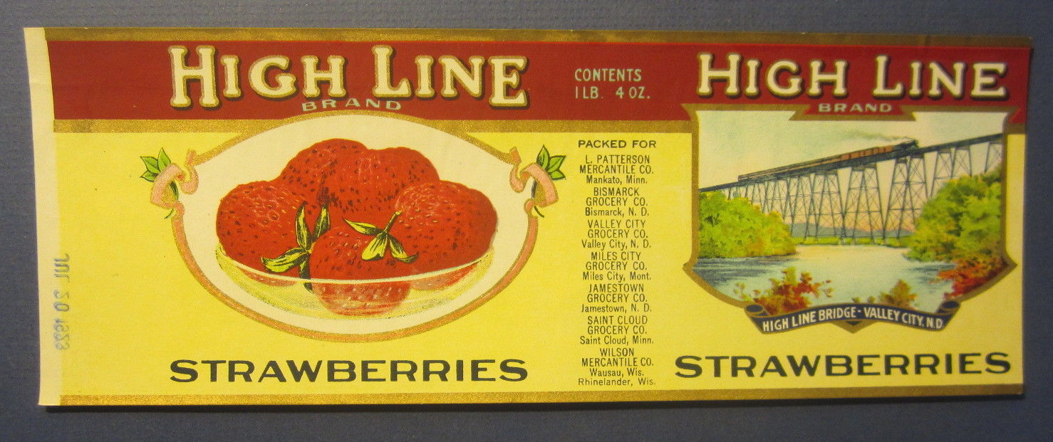 Title (ebay affiliate link): Old Vintage 1923 HIGH LINE Stawberries Can LABEL - Train / Bridge Valley City ND