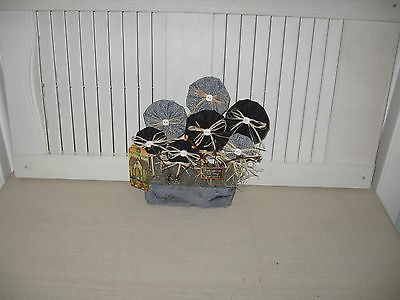 Title (ebay affiliate link): Handmade Primitive Shelf Sitter "Black & Gray Yo Yo Flowers w/Pip Berry& Planter