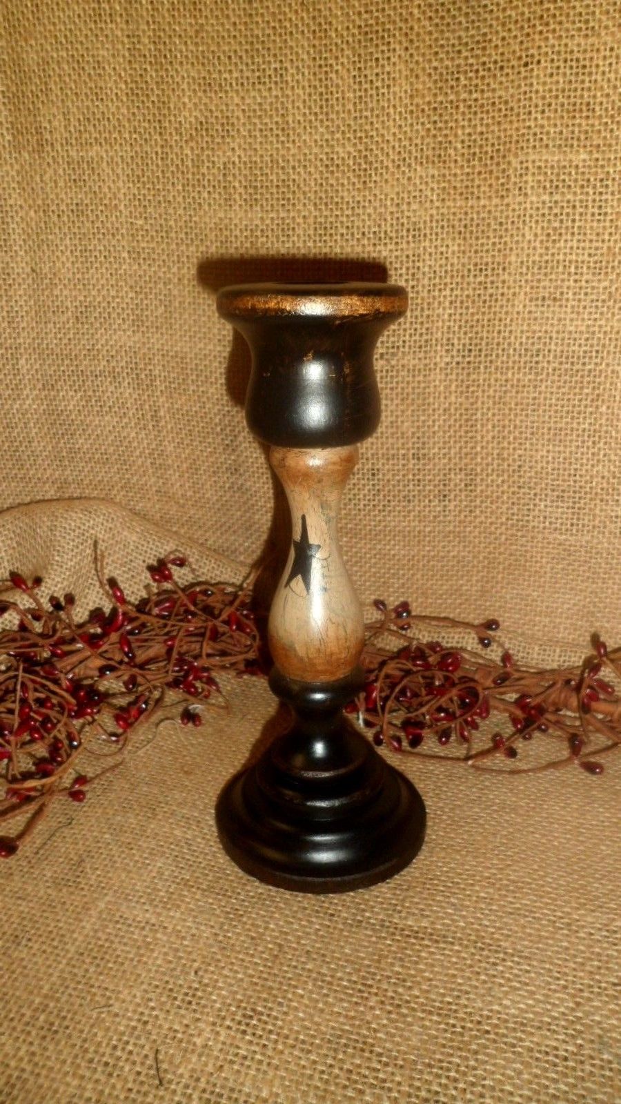 Title (ebay affiliate link): PRIMITIVE WOOD TALL SPINDLE CANDLE HOLDER TAN CRACKLE STAR AGED COUNTRY DECOR