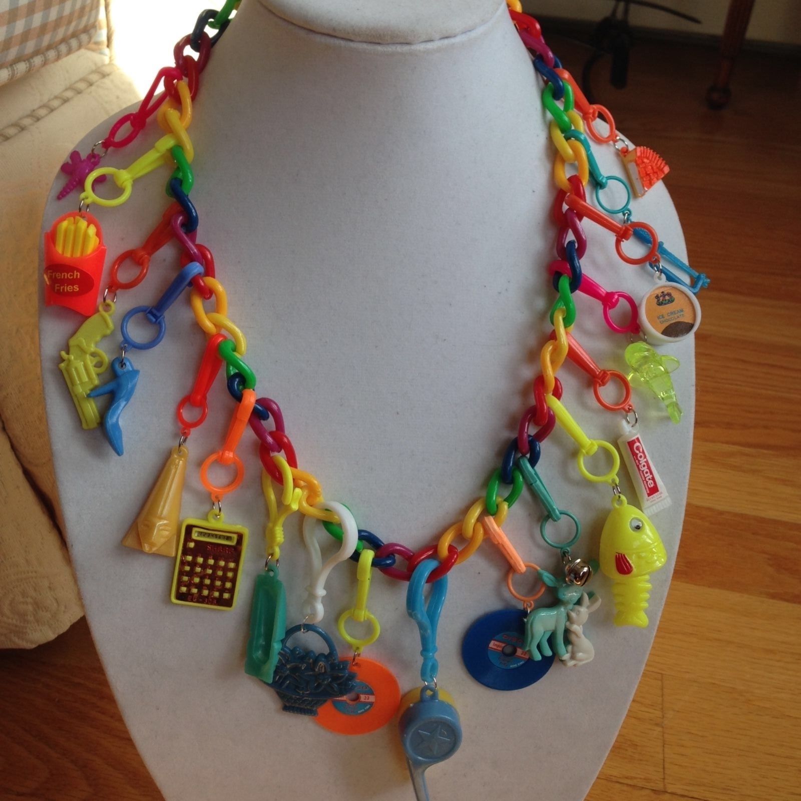 Title (ebay affiliate link): Vintage 80's Plastic Bell Charm Necklace Pistol Deer Record Shoe Retro Clip on