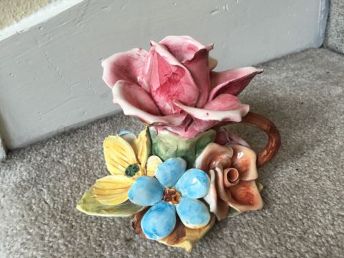Title (ebay affiliate link): Vintage Large CAPODIMONTE ITALY ROSE FLOWER CANDLE HOLDER Blue, Pink, Yellow