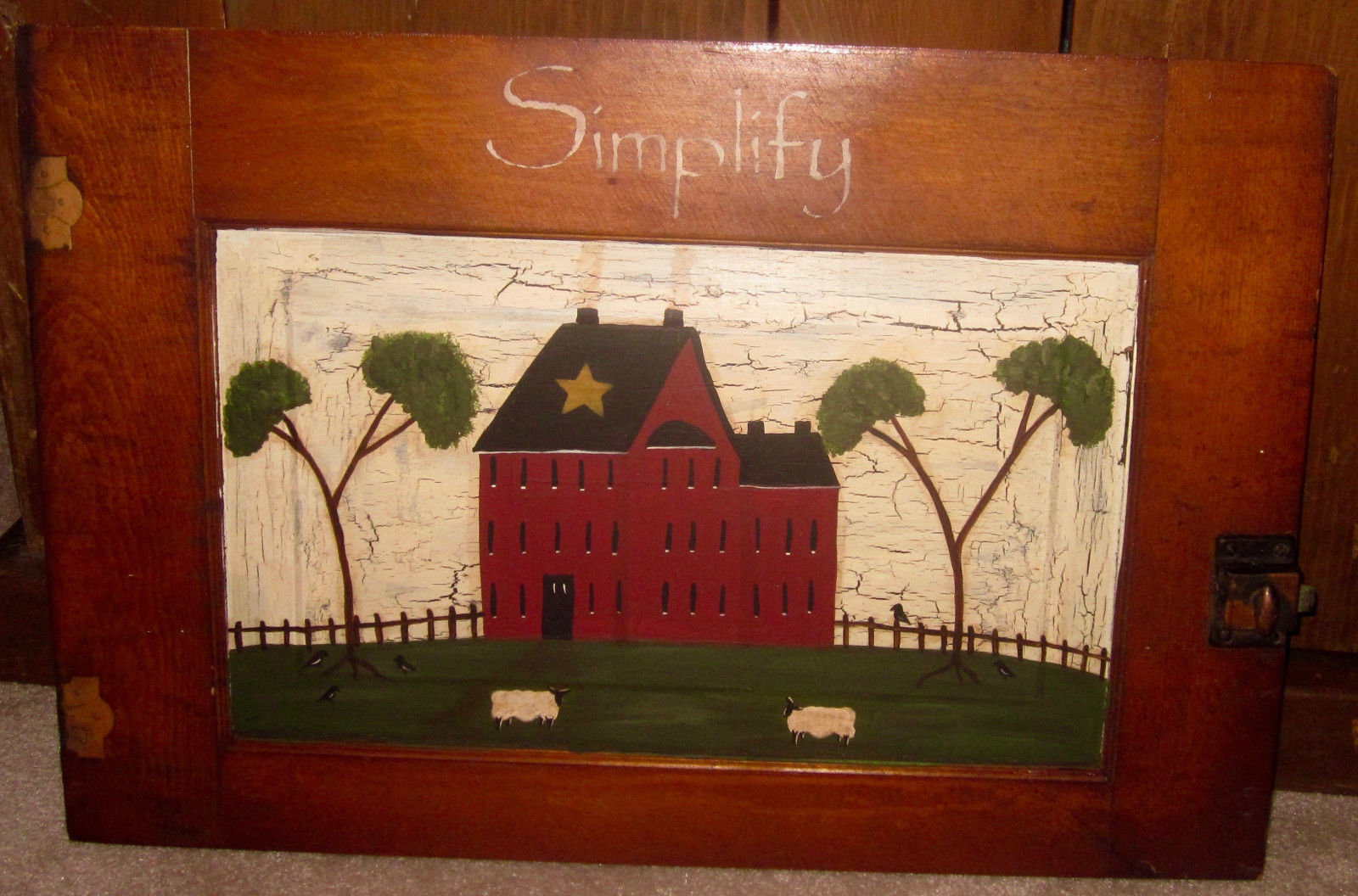 Title (ebay affiliate link): *~*PRIMITIVE*~* HP FOLK ART PRIM SALTBOX SCENE * SHEEP * CROW *~* OLD DOOR PANEL
