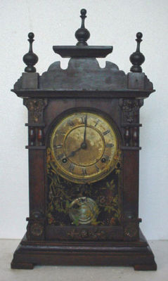 ANTIQUE 3 FINIAL CROWN COLOR GLASS PANEL MANTLE CLOCK