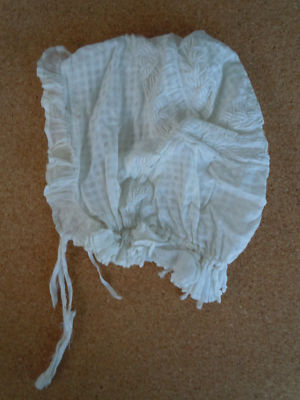 Title (ebay affiliate link): Lovely Antique White Windowpane DOLL BONNET Ruffle Brim
