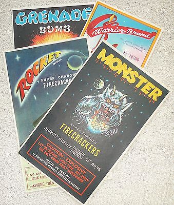 (4) FIRECRACKERS LABELS-Monster, Rocket, Warrior, Grenade, all NM---free shippin