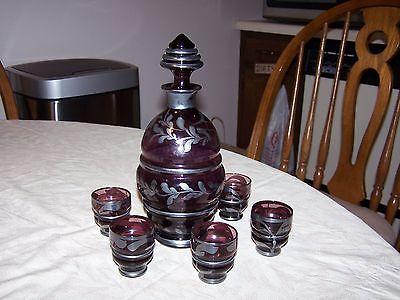 Title (ebay affiliate link): Vintage Ornate Purple Glass Liquor Decanter & 5 Glasses Set With Silver Overlay