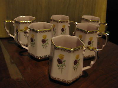 JSK MADE IN CZECHOSLOVAKIA SIX FLORAL PINK & GOLD PORCELAIN CUPS