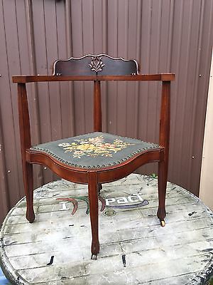 Antique chair blue grey embroidered needlepoint seat curved wood back furniture