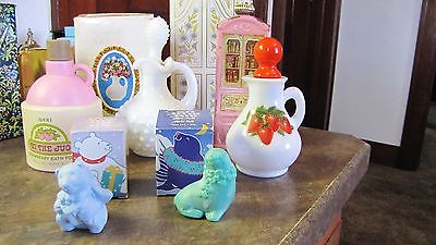 Lot 6 Foaming Bath Oil Soap Avon Bottles Milkglass Hobnail,Strawberries,Moonwind