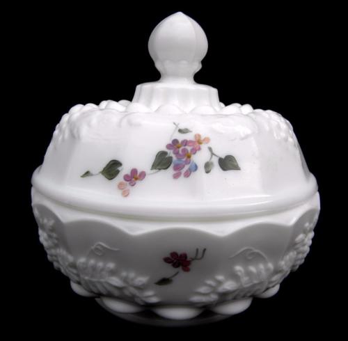 Title (ebay affiliate link): Fenton Vintage 1980's Hand Painted 'Violets' White Milk Glass Lidded Candy Dish