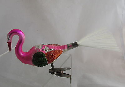 Antique Clip Glass Christmas Tree Ornament Figural Pink Bird w/Spun Glass Tail