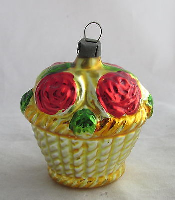Antique Glass Christmas Tree Ornament Figural Gold Basket w/Red Roses