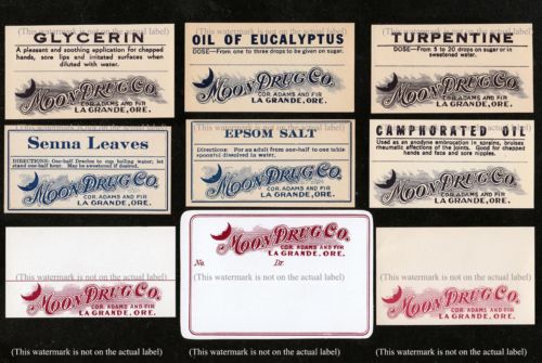 Title (ebay affiliate link): 9 Antique MOON DRUG Pharmacy Drugstore LAGRANDE OREGON Medicine Bottle Label Lot
