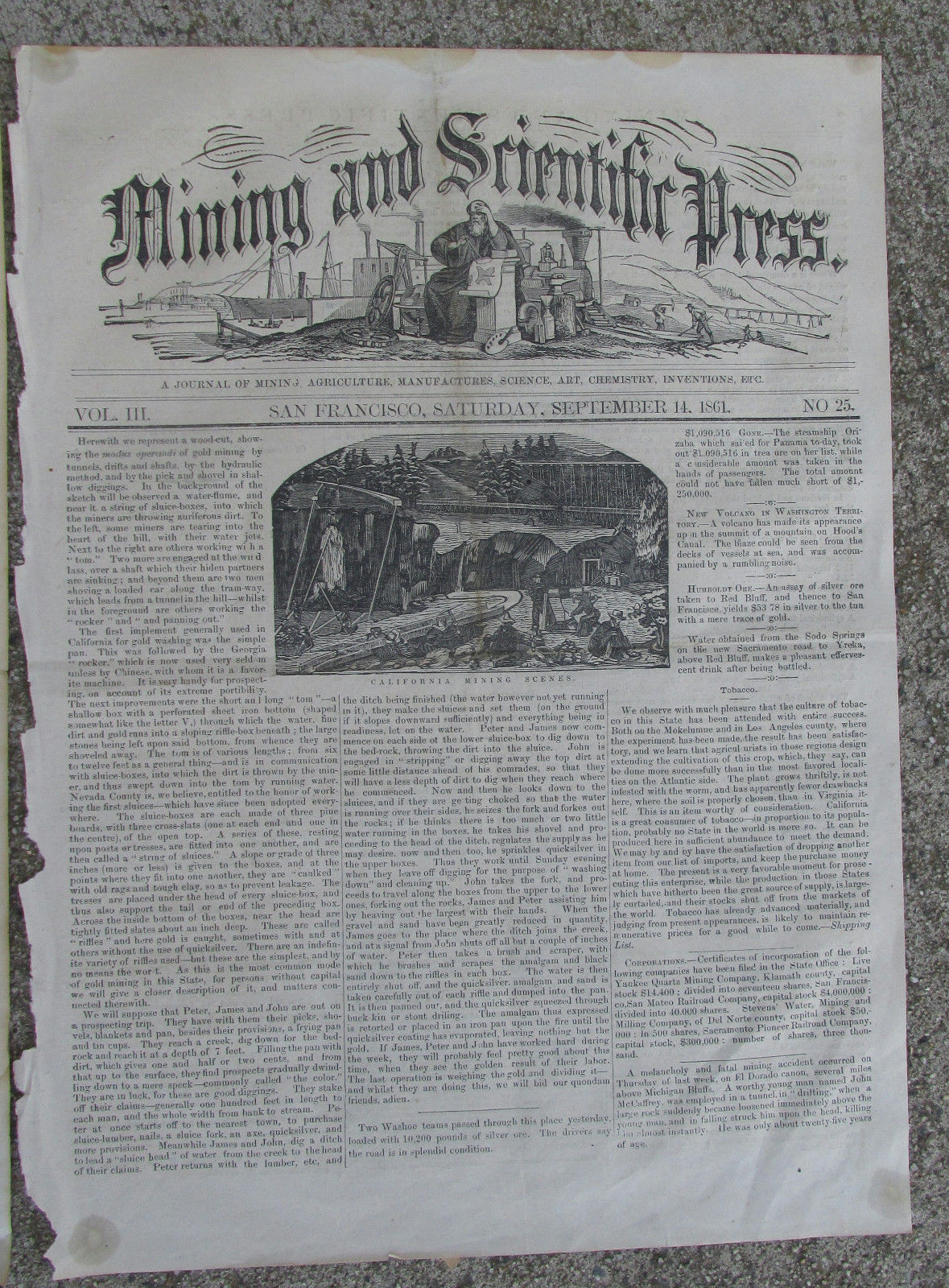 Title (ebay affiliate link): 2 ANTIQUE CALIF GOLD & SILVER MINE NEWSPAPER FRONT PAGES - 1861 !!!