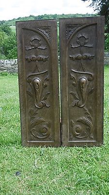 SUPERB Pr 19thc OAK CARVED PANELS WITH ART NOUVEAU BOW & ACANTHUS LEAF