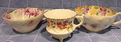 Title (ebay affiliate link): SET OF 3 TEA CUPS - TWO HAND PAINTED PANSIES AND ONE FLOWERS - ALL GOLD TRIMMED