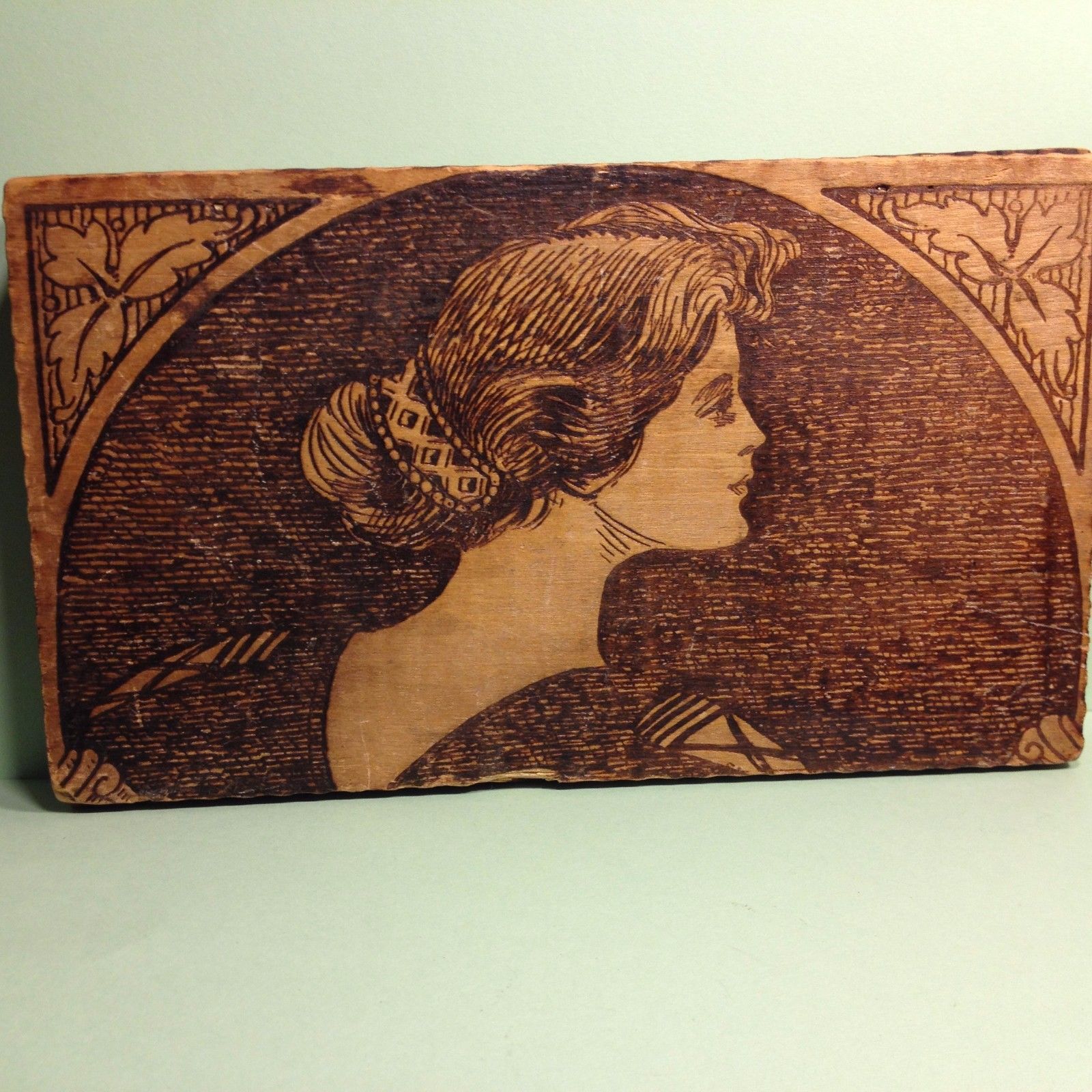 Title (ebay affiliate link): Antique Art Nouveau Maiden Woman Pyrography Flemish Wood Box w/ Glass Czech Bead