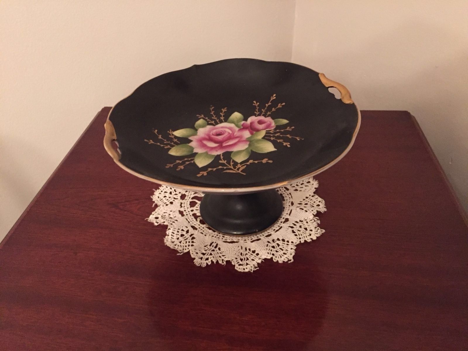 Title (ebay affiliate link): Antique Black Handpainted Porcelain Compote with Gold Trim and Pink Roses