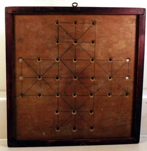 Title (ebay affiliate link): Antique Vtg Homemade 10x10" Wooden Game Board Played w Pegs or Marbles c1940s