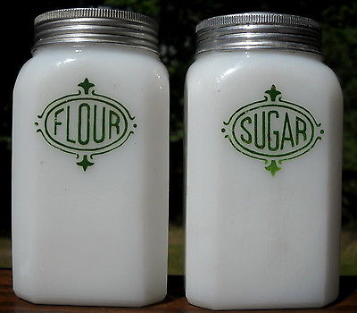Title (ebay affiliate link): Pair Vtg RANGE TOP SHAKER Canister FLOUR SUGAR ~ Chef Boy AR Dee ~ Milk Glass
