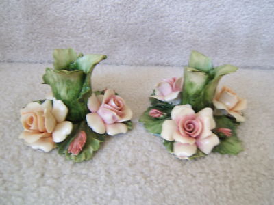 Pair of CAPODIMONTE Candle Holders - Roses - ITALY