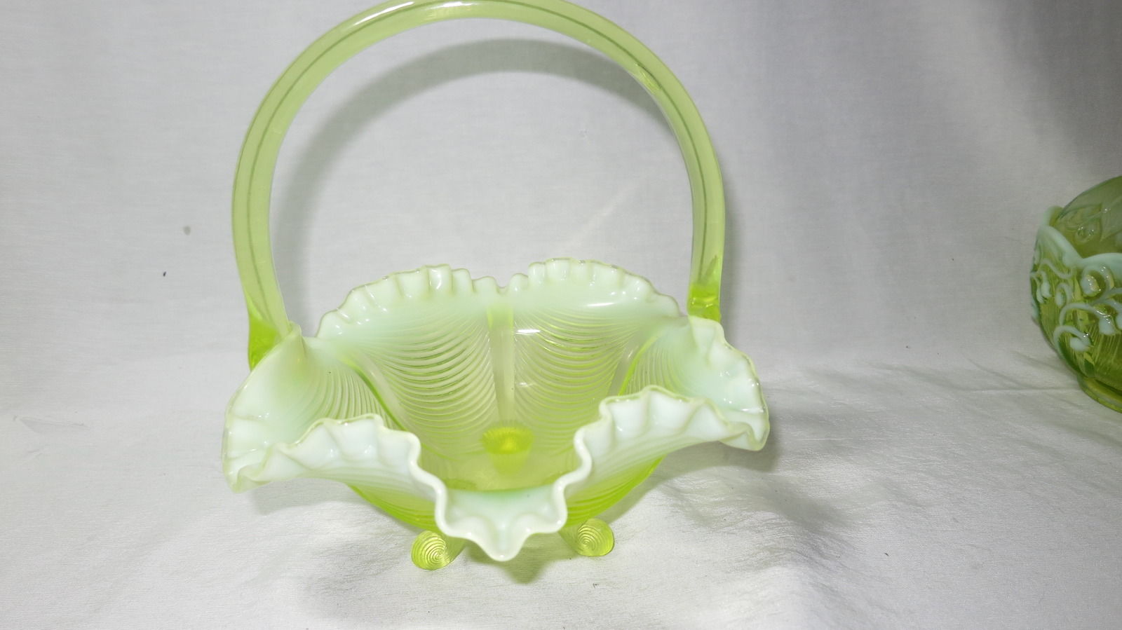 Title (ebay affiliate link): VINTAGE FENTON URANIUM VASELINE GLASS OPALESCENT RUFFLED handled RIBBED BASKET