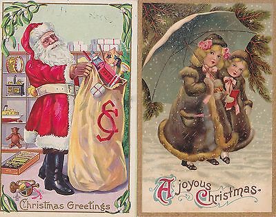 Lot of 2 Vintage Xmas Postcards - Santa & Bag, Girls under Umbrella, Fur Coats